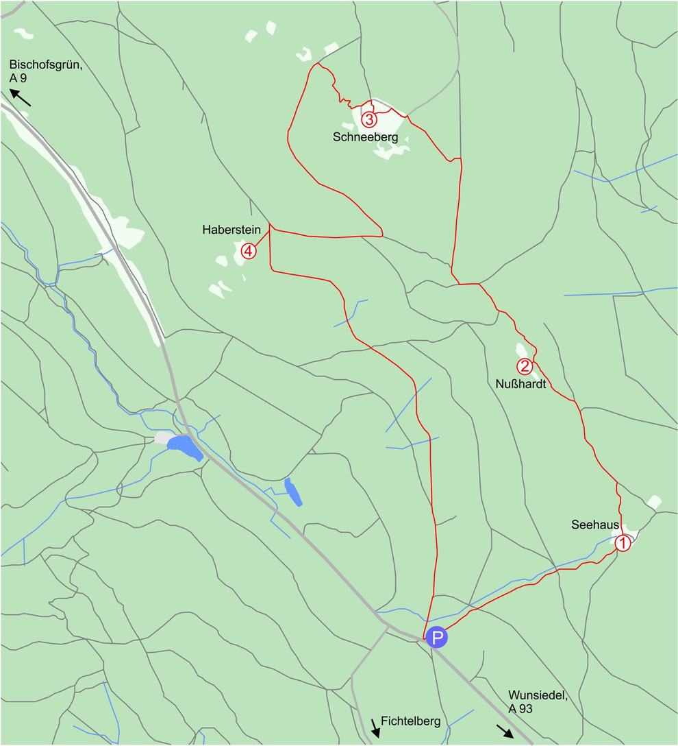 Wie bereits angedeutet ist die Datensituation für das Fichtelgebirge mangelhaft. Auf der vorgeschlagenen Runde ist daher keinesfalls garantiert, eine der seltenen Brutvögel zu sehen. Insbesondere für die begehrten Hühnerarten werden weder an dieser noch an anderer Stelle konkrete Hinweise gegeben. Vom Ausgangspunkt folgt man den Wegweisern bergauf in Richtung des Seehauses, einer Hütte auf dem Hügelkamm (1).
